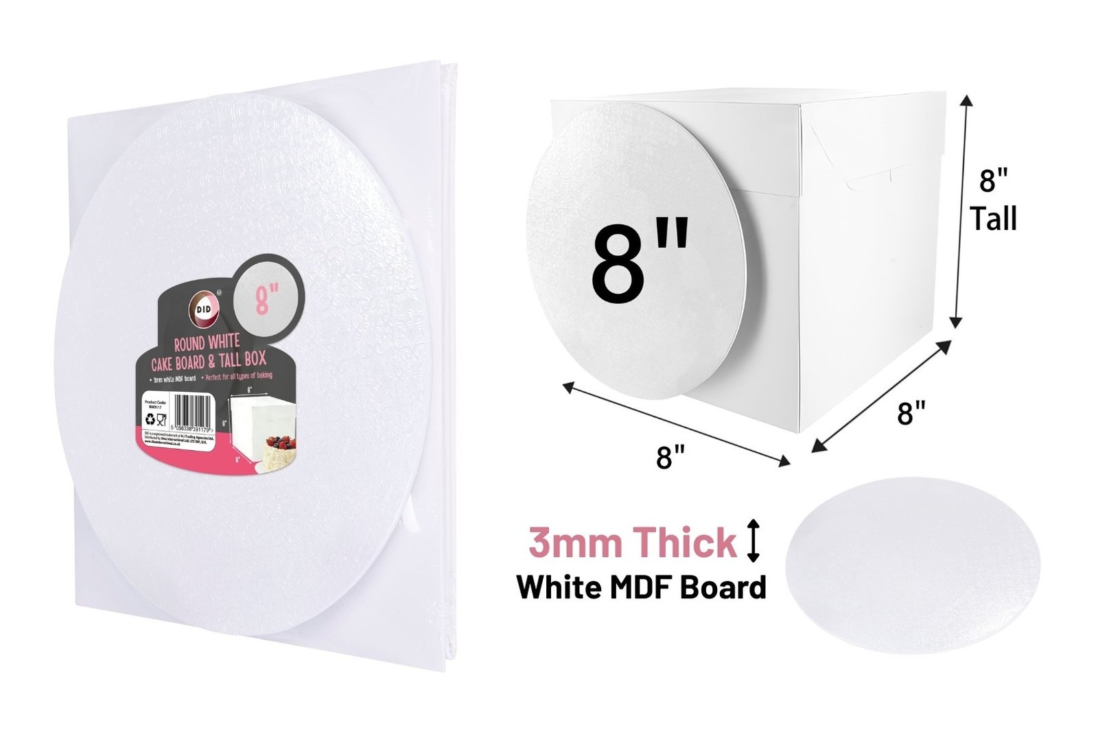 The 8″ Round White Cake Board & Tall Box Set is perfect for bakery use, home baking, and special occasions. The sturdy cake board provides a stable base for cakes, while the tall box ensures safe transport and elegant presentation without damaging decorations or icing.
