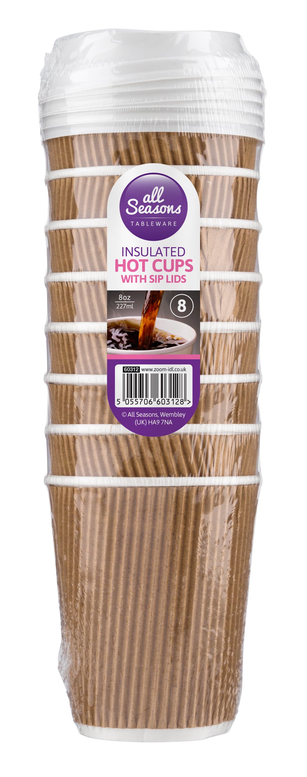 These 227ml (8oz) insulated hot cups with sip lids are ideal for serving coffee, tea, hot chocolate, and other hot beverages safely. Made from durable, food-safe material with insulation, they keep drinks warm while protecting hands from heat.
