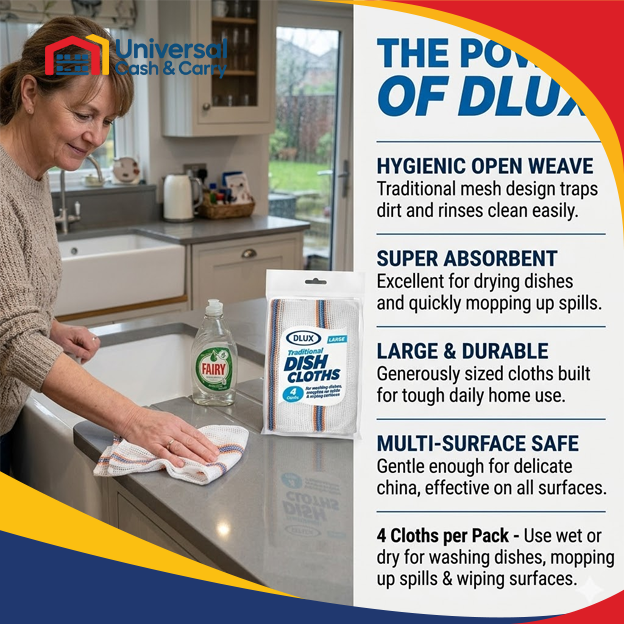 Reliable and practical for everyday kitchen cleaning, the DL 4-Pack Traditional Dish Cloths are ideal for washing dishes, wiping surfaces, and general kitchen use. Made from durable, absorbent material, these classic dish cloths are reusable and easy to maintain, making them a kitchen essential.