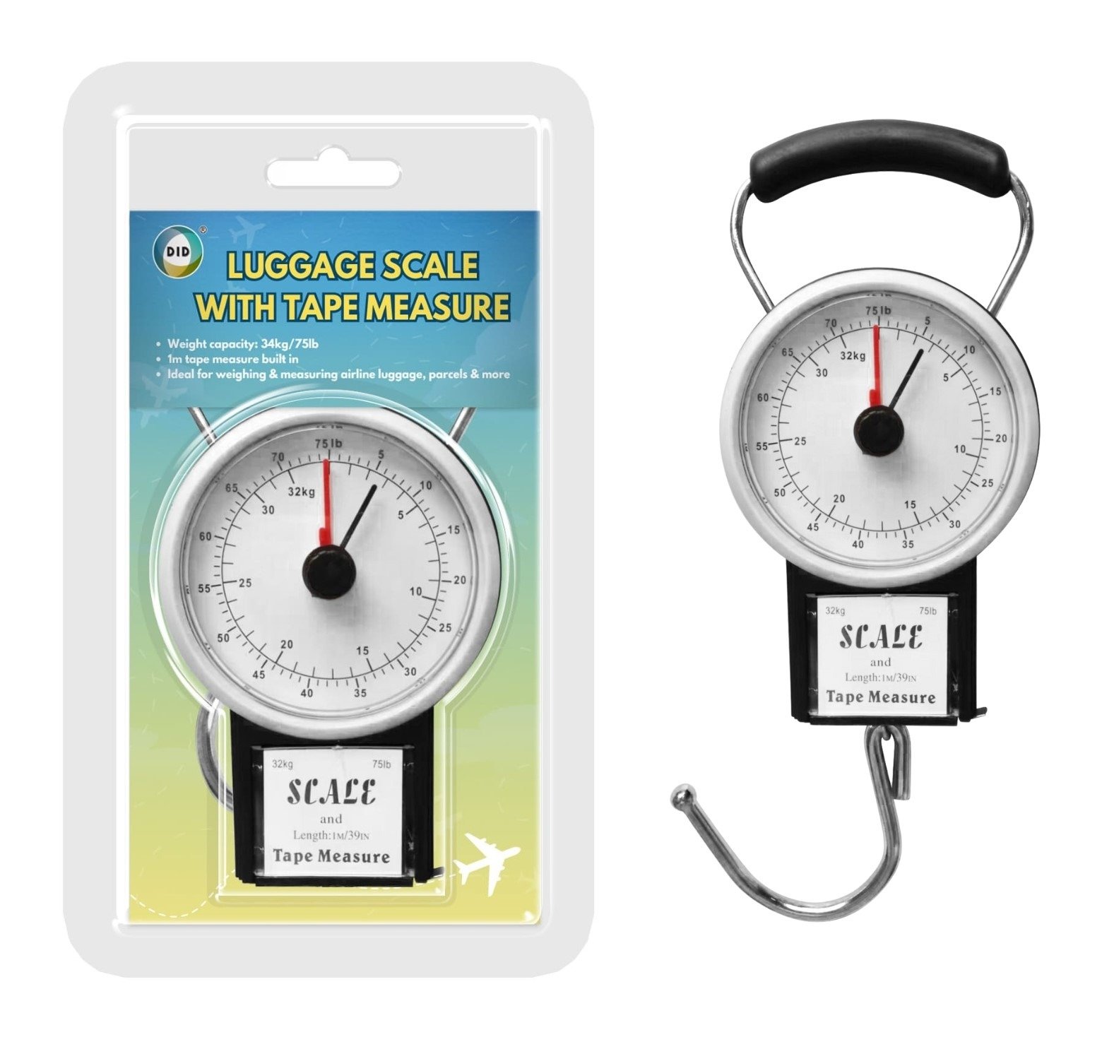 - Â Dual function: weighs luggage + measures size