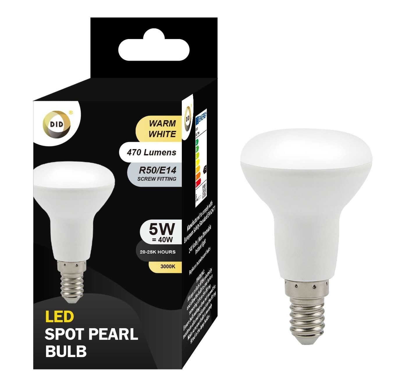 Its R50 reflector (spot pearl) design helps direct light more effectively, making it ideal for spotlights, cabinet lighting, wall fittings, and display areas. The warm white colour temperature creates a comfortable and inviting atmosphere in homes, shops, and hospitality environments.